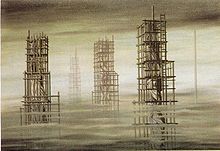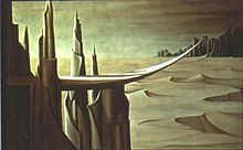 Critics during Sage's lifetime frequently compared her work to that of Tanguy, who was better known, and usually assumed that, when their work had features in common, those features must have originated with him.[77] More recent feminist scholars have stated that the influence more likely was mutual—what Judith Suther calls "a constant, usually unconscious interchange."[78] Suther and others also point out differences between the two artists: for example, the large architectural constructions that dominate Sage's paintings are quite unlike the smaller biomorphic or metallic forms that people associate with Tanguy's landscapes.