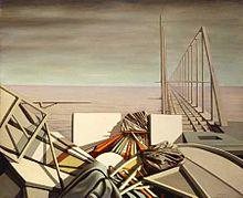 Sage moved to Paris in March 1937 and rented a luxurious apartment there.[26] In early 1938 she saw the International Surrealist Exhibit at Galerie Beaux-Arts; consisting of 299 pieces by 60 artists from 14 countries.[27] She was especially struck by the paintings of Italian artist Giorgio de Chirico, which featured what Magdalena Holzhey, in a book devoted to de Chirico, calls "empty squares and receding depths, shadowy arcades and soaring towers."[28] Sage bought one of de Chirico's paintings, La Surprise, and kept it all her life.[29]