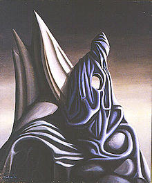 Both Suther[79] and Régine Tessier, the latter in a sketch of Sage in Notable American Women: The Modern Period,[80] note key features of Sage's mature work. Most of Sage's paintings focus on free-standing architectural structures, including walls, towers, and latticework, which could represent buildings either under construction or ruined and decaying. Her use of arched entryways and slanted perspectives may in be attributed to the painter Giorgio de Chirico.[81] Some contain figures that might or might not be human, hidden by flowing drapery. (Le Passage, one of Sage's last paintings, is perhaps the only one containing a definite human figure; even Small Portrait, thought by many to be a self-portrait, is hardly recognizable as a face.) Like Tanguy, Sage often sets her objects on deserts or plains that recede to immeasurably distant horizons. She renders her forms in meticulous, photographic detail, using a gray-green-ochre palette that Tessier describes as "reminiscent of the sulphurous light before a thunderstorm".[82] Critics frequently called Sage's work disturbing or depressing, even when they praised her painterly skill.[83]