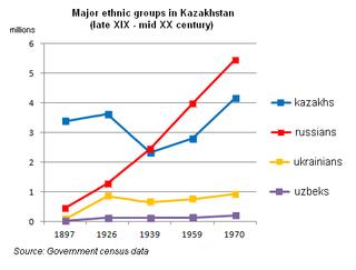 One of the greatest factors that shaped the ethnic composition of Kazakhstan was 1920s and 1930s famines. According to different estimates only in famine of 1930s, up to 40% of Kazakhs (indigenous ethnic group) either died of starvation or fled the territory.[3] Official government census data report the contraction of Kazakh population from 3.6 million in 1926, to 2.3 million in 1939.