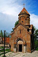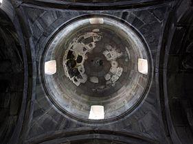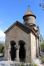 The church of Surp Harutyun (Holy Resurrection), standing on a forest glade, away from the main group, was built by a son of Hasan in 1220. This is a small, outwardly rectangular. domed-hall church with a lofty cupola. The only entrance, with a small vestry in front of it, is from the west. As distinct from the ordinary vestries, it has a vaulted ceiling, and is narrower than the church. A distinctive feature of the structure is that it has, on its western facade, twin openings topped with arches which rest on the wall-attached and intermediate columns. This gives the structure the appearance of an open passage. There are many graves in the church which was probably a family burial vault.