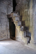 The semicircular altar apse has two-storey vestries on either side. Three triangular niches behind the altar provide openings for light. The sole of the altar has carved geometrical ornament, alternating with rosettes in places.