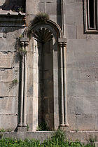 The architectural details of the building are rather modest. The small windows are topped by profiled edges above which there are, in the middle window of the southern facade, octafoil rosettes and sun dials, widespread in Armenia and, on the western facade, jugs. As distinct from the portals of the churches, the only western entrance is built as a rectangular opening with a niche framed with bunches of small columns and an arch. In the interior, the fine geometrical ornaments on the capitals of the columns and on the cornice of the tent base immediately catch the eye.