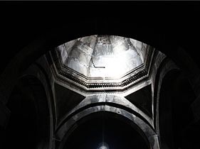 The gavit, built in the second half of the 12th century and attached to the western facade of S. Grigor church, is an early structure of this type. The rectangular hall is divided into nine sections by four heavy free-standing columns.