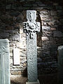 The complete and well-preserved late 8th-early 9th century cross[2] is carved from local grey-green epidiorite. It is only decorated on one face, the sides and back being dressed smooth without further decoration. Its proportions are unusual, with very short side-arms broader than the shaft and upper limb. The latter shows the archangel St. Michael standing over a serpent (a symbol of triumph over the devil). The lower limb shows Christ on the Judgement Seat. He is holding a book, possibly the Bible or New Testament, symbolising mercy, in his left hand, and a flail in his right, symbolising judgement. There is a circular design at the crossing, with three round objects in the centre, which may symbolise the Holy Trinity. Around this are four animals representing the four evangelists.