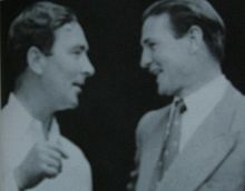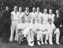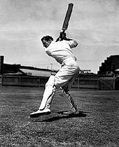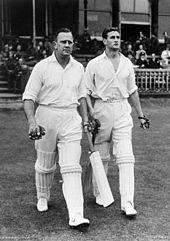 Miller was invited to join a RAAF team in London.[80] The team was officially formed in preparation for the 1943 season and Miller's selection led to the first of many brushes with death: in April, while away with the team, some of his comrades were killed in a German air strike.[76][80][81][82][83][84] Miller played his first match at Lord's against Warner's XI, a team that featured past, current and future England players, including Bob Wyatt, Gubby Allen, Trevor Bailey and Alec Bedser.[85][86][87] Miller top-scored in the first innings with 45 and added 21 not out, with two sixes, in the second innings.[88] The RAAF played eight matches that season and Miller's top score was 141 against Public School Wanderers.[88] He went on to play for Dominions against Warner's XI in August, scoring 32 and two.[89] The match marked the first meeting between Miller and his good friend, England batsman Denis Compton and his bowling began to attract media attention.[90] In the final match of the season at Lord's between the RAAF and the Royal Air Force, Miller took 3/23 and scored 91.[91] The success of RAAF and Dominions that season, especially the attractive batting by Miller and Keith Carmody,[92] prompted Warner to begin planning for a "Test" series between the respective armed services of England and Australia.[93][94]
