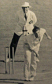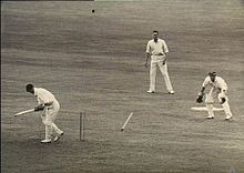 Miller warmed up for the Second Victory Test by top-scoring for the RAAF against Lancashire and the RAF.[139] In the Test, played at Bramall Lane, Miller went wicketless and scored 17 in the first innings.[139][140][141][142] In the second innings, Miller bowled a fierce spell,[137] hitting Test world record holder Len Hutton and Cyril Washbrook on the arm and head respectively, provoking an angry crowd reaction.[142][143][144] At the time, Miller had a leisurely attitude towards bowling, so his success led to calls for him to start taking it seriously, instead of simply jogging in and releasing the ball.[144] Despite this, Australia lost the match.[144][145][146]