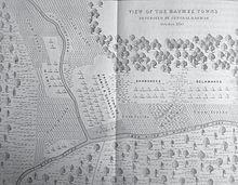Later that year during the Northwest Indian Wars, the United States General Josiah Harmar led an invasion of Kekionga. His army counted seven distinct villages in the vicinity of Kekionga, known collectively as "the Miami Towns" or Miamitown.[15] The collected villages of Kekionga had advance knowledge of the army, and most of the people evacuated the area, carrying as many of their food stores as possible. The traders took their trade goods to Fort Detroit, after giving out all their arms and ammunition to the Miami defenders.[16] Major Ebenezer Denny, an officer with the US, drew a map of Kekionga in 1790, which showed a collection of eight distinct villages, surrounded by 500 acres of cornfields.[17][18] The United States army burned some villages and food stores, but was forced to retreat after suffering high casualties in a series of battles with forces led by Little Turtle.
