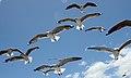Kelp gulls are omnivores like most Larus gulls, and they will scavenge as well as seek suitable small prey. They gather on landfills and a sharp increase in population is therefore considered as an indicator for a degraded environment.[8] Kelp gulls have been observed feeding on living right whales since at least 1996.[9] The kelp gull uses its powerful beak to peck down centimetres into the skin and blubber, often leaving the whales with large open sores, some of which have been observed to be half a meter in diameter. This predatory behavior has been documented in Argentinian waters.[10] At rocky sites along the Southern African coast, such as at Boulders Beach in Cape Town, kelp gulls (Larus dominicanus vetula) can be seen picking up shellfish and repeatedly flying up several meters and dropping them onto the rocks below in order to break them open.[11] They have also been reported pecking the eyes out of seal pups on the coast of Namibia before attacking the blind seals in a group.[12]