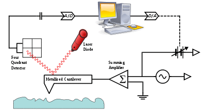 When there is a direct-current (DC) potential difference between the tip and the surface, the AC+DC voltage offset will cause the cantilever to vibrate. The origin of the force can be understood by considering that the energy of the capacitor formed by the cantilever and the surface is