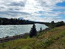 The Kenai River [Kee-nye] is a meltwater river that drains the central Kenai Peninsula region. Its source is the Kenai Lake.[1] Near Cooper Landing, the lake narrows to form the river. About 12 miles (19 km) from the lake, the river passes through Kenai Canyon for about 2 miles (3.2 km) of fast-flowing whitewater rapids. The Russian River empties into the Kenai several miles west of Cooper Landing. Seventeen point three miles (27.8 km) from Kenai Lake, the river enters Skilak Lake. The Kenai Lake to Skilak section is commonly referred to as the "Upper River". The 19.5 miles (31.4 km) portion from Skilak Lake downstream to the Sterling Highway bridge near Soldotna is known as "Middle River". The final 21 miles (34 km) from the bridge to the mouth at Cook Inlet is known as the "Lower River", where the flow is much gentler. The final 12 miles (19 km) are greatly influenced by changing tides.[3]