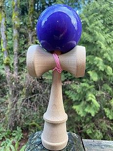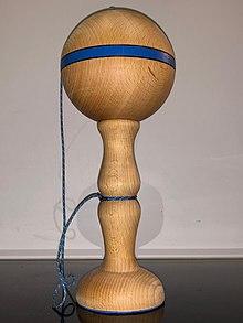 The kendama (けん玉, "sword [and] ball") is a traditional Japanese skill toy. It consists of a handle (ken), a pair of cups (sarado), and a ball (tama) that are all connected together by a string. On one end of the ken is a cup, while the other end of ken is narrowed down, forming a spike (kensaki) that fits into the hole (ana) of the tama. The kendama is the Japanese version of the classic cup-and-ball game,[1] and is also a variant of the French cup-and-ball game bilboquet. Kendama can be held in different grips, and the tricks and combinations that can be done are limitless. The principle of these toys is the same: catching one object with another, where both are joined by a string.