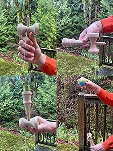 3. While the ball is in mid-air, rotate the ken downwards so that the bottom cup is facing up