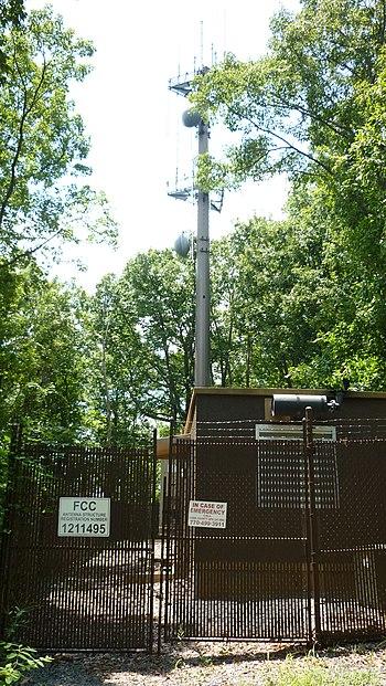 Several small radio antennas, which are atop the mountain near the summit, belong to the U.S. government and the government of Georgia. Originally on four separate wooden telephone poles, they were consolidated to a metal monopole around 2005. The quonset huts which house the transmitters and other telecom equipment are painted solid green or brown to camouflage them. Power lines are buried, and generators supply backup power in the event of a power failure.