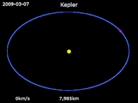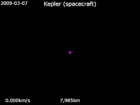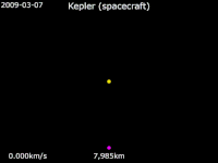 NASA has characterized Kepler's orbit as "Earth-trailing".[58] With an orbital period of 372.5 days, Kepler is slowly falling farther behind Earth (about 16 million miles per annum). As of May 1, 2018, the distance to Kepler from Earth was about 0.917 AU (137 million km).[3] This means that after about 26 years Kepler will reach the other side of the Sun and will get back to the neighborhood of the Earth after 51 years.