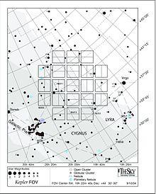 Kepler's field of view covers 115 square degrees, around 0.25 percent of the sky, or "about two scoops of the Big Dipper". Thus, it would require around 400 Kepler-like telescopes to cover the whole sky.[80] The Kepler field contains portions of the constellations Cygnus, Lyra, and Draco.