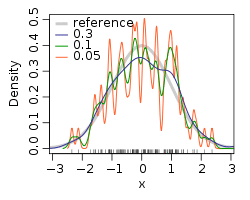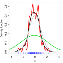 The bandwidth of the kernel is a free parameter which exhibits a strong influence on the resulting estimate. To illustrate its effect, we take a simulated random sample from the standard normal distribution (plotted at the blue spikes in the rug plot on the horizontal axis). The grey curve is the true density (a normal density with mean 0 and variance 1). In comparison, the red curve is undersmoothed since it contains too many spurious data artifacts arising from using a bandwidth h = 0.05, which is too small. The green curve is oversmoothed since using the bandwidth h = 2 obscures much of the underlying structure. The black curve with a bandwidth of h = 0.337 is considered to be optimally smoothed since its density estimate is close to the true density. An extreme situation is encountered in the limit (no smoothing), where the estimate is a sum of n delta functions centered at the coordinates of analyzed samples. In the other extreme limit the estimate retains the shape of the used kernel, centered on the mean of the samples (completely smooth).