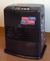 The Japanese non-vented "fan" heater burns kerosene gas and is known as a gasification type heater. The liquid kerosene fuel is pre-heated via an electric heating element to vaporize the fuel. The resulting gas is collected and forced into the burn chamber where it is ignited and burns with a blue flame, similar to propane. The unit is fuelled through a conventional side mount cartridge style tank just like other non-vented wick type radiant heaters.