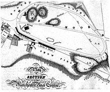 The racecourse is shown on the map of 1848[3] as a roughly oval-shaped course extending around the west, north and east of the moor, crossing Moor Lane and carrying on around the ground that is now the home of Salford City F.C., roughly following the line of what is now Nevile Road. John Byrom (1692–1763), the owner of Kersal Cell, was greatly opposed to the racing and wrote a pamphlet against it, but the racing continued for fifteen years until, probably through Dr Byrom's influence, they were stopped in 1746, the year of the Jacobite rising. After this there is known to have been at least one race in 1750;[15] regular fixtures recommenced in 1759, and were then held every year until 1846, when they were transferred to the New Barns racecourse.[14] Racing carried on there until the new Castle Irwell Racecourse was built, just across the river from the moor, in Lower Broughton in 1847.[16] Today part of the course can still be seen as a wide, well-worn path stretching from east to west along the northern side of the moor.[17]
