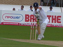 Speculation over when Pietersen would play for the Test team was ended in July with the announcement by the England chairman of selectors, David Graveney, that Pietersen had been selected ahead of Graham Thorpe.[112] He made his debut in the first Ashes Test at Lord's, becoming the 626th player to play for the national side.[113] He came into bat at 18–3 and he made 57 on debut in his first innings. In the second innings, he similarly came in after a batting collapse and finished making a second half-century and finished the innings on 64 not out, becoming only the fourth player to top score in both innings on debut for England, the eighth England player to score a half-century in each innings on his debut, and the third cricketer to do so at Lord's.[114] England were thrashed by 239 runs before moving onto Edgbaston where he came in a more comfortable position scoring 71 in the first innings. He had a good partnership with Andrew Flintoff where the pair put on 103 very quickly. He made 20 in the second innings coming in at 31–4. He was involved in two controversial decisions: he gloved his first ball from Brett Lee, but the umpire turned down the appeal, and he was later given out to a ball from Shane Warne that hit his pad then elbow before being caught by Adam Gilchrist. England won the match by two runs.[115]