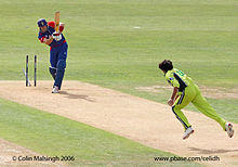 Pietersen bowled his first delivery in Test match cricket on 4 June, against Sri Lanka.[139] His first Test wicket came against Pakistan later in the summer when Kamran Akmal got a thin edge through to Geraint Jones.[140] Later in June, Pietersen scored 17 in the Twenty20 International as England lost by 2 runs to Sri Lanka.[141] The twenty over match against Pakistan was no better, Pietersen being bowled by Mohammad Asif for a golden duck as Pakistan helped themselves to a five-wicket victory.[142]
