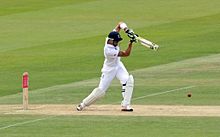 In 2000, Nottinghamshire coach Clive Rice, who had seen Pietersen play in 1997 in South Africa at a schools week, heard that Pietersen was playing club cricket for the Cannock Cricket Club and offered him a three-year contract to play for the county.[26] His maiden first-class century came on his Nottinghamshire debut against Loughborough UCCE.[54] In his first season, he made 1,275 runs with an impressive batting average of 57.95,[55] including 218 not out in an unbroken sixth-wicket stand of 352 with John Morris at Derby in July, after having been out lbw for a duck in the first innings.[56] These performances led to praise in the Wisden Cricketers' Almanack: "If he can maintain his first season's form, the name of Pietersen should be pencilled in for future Test squads."[55] This form did indeed continue into the following year: he made another unbeaten double-century, against Middlesex, taking part in a partnership of 316 for the fourth wicket with Darren Bicknell.[57] This period proved to be a purple patch for the batsman, scoring four consecutive centuries (254 not out, 122, 147 and 116) in one week in August.[58]