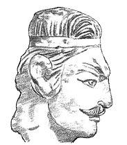 Some of the Khalchayan sculptural scenes are thought to depict the Kushans fighting against a Saka tribe.[7] The Yuezhis are shown with a majestic demeanour, whereas the Sakas are typically represented with side-wiskers in more or less grotesque attitudes.[7]
