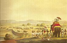 In Mysore, the khedda system was first introduced by G P. Sanderson in 1873–1874 at Kardihalli. The venue of such events was the Kakanakote forest on the banks of the Kabini River. This was organized by the forest department at frequent intervals, usually coinciding with the visit of a dignitary to the state. Tipu Sultan, the ruler of Mysore, had failed to capture elephants.[5] Tipu Sultan and his father Hyder Ali were not successful in trapping wild elephants in spite of using their army. The first attempt to capture the elephants by Colonel Pearson, a British Army Officer, had also failed. However, G.P. Sanderson, who worked for the government of Mysore in the forest department, in his book titled Thirteen Years Among The Wild Beasts of India has noted: "Hyder made a trial, a century before, in the Kakanakote Jungles, but had failed and had recorded his opinion that no one would ever succeed, and his curse upon any one that attempted to do so, on a stone still standing near the scene of his endeavors.” The term “game” is used to denote wildlife hunting as an official royal sport, which was practiced by the erstwhile Maharajas of princely states of India like Mysore in which British officers also took keen interest. Such games were specifically arranged as an entertainment to visiting Dukes and Viceroys.[10] One such khedda operation was arranged by Sanderson by the river-drive method through the Kabini River in honour of the Grand Duke of Russia when he visited Mysore, in 1891.[11]