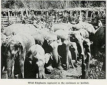 A khedda (or Kheddah) or the Khedda system was a stockade trap for the capture of a full herd of elephants that was used in India; other methods were also used to capture single elephants.[1] The elephants were driven into the stockade by skilled mahouts mounted on domesticated elephants.[2][1] This method was practiced widely in North-east India, particularly in the state of Assam,[3] mostly in South India,[4] and in particular in the erstwhile Mysore State (now part of Karnataka) state.[5]