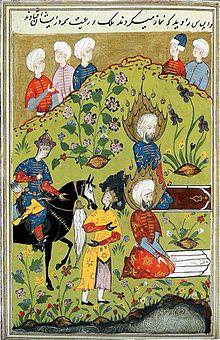 In various accounts al-Khidr has been linked to the figure of Dhu al-Qarnayn, who is either identified as Cyrus the Great or the Himyarite King Ṣaʿb.[81] In one version, al-Khiḍr and Dhul-Qarnayn cross the Land of Darkness to find the Water of Life. Dhul-Qarnayn gets lost looking for the spring but al-Khiḍr finds it and gains eternal life. According to Wahb ibn Munabbih, quoted by Ibn Hisham, King Ṣaʿb was given the epithet Dhu al-Qarnayn by al-Khidr after meeting him in Jerusalem.[81] There are also several versions of the Alexander romance in which al-Khiḍr figures as a servant of Alexander the Great. In the Iskandarnamah by an anonymous author, al-Khiḍr is asked by Dhul-Qarnayn to lead him and his armies to the Water of Life.[82] Al-Khiḍr agrees, and eventually stumbles upon the Water of Life on his own.[83]