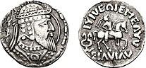 From the 1st century BCE, Chorasmia developed original coins inspired from Greco-Bactrian, Parthian, and Indo-Scythian types. Artav (Artabanus), a Chorasmian ruler of the 1st-2nd century CE, whose coins were discovered in the capital city of Toprak-Kala, imitated the type of the Kushan Heraios and were found together with coins of the Kushan rulers Vima Kadphises and Kanishka.[33]