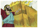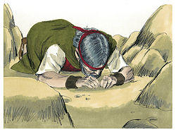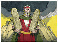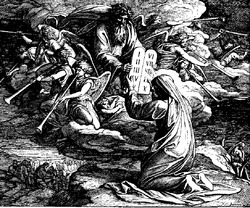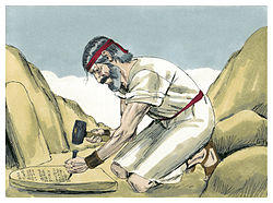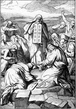 In the long second reading (aliyah), God gave Moses two stone tablets inscribed by the finger of God.[21] Meanwhile, the people became impatient for the return of Moses, and implored Aaron to make them a god.[22] Aaron told them to bring him their gold earrings, and he cast them in a mold and made a molten golden calf.[23] They exclaimed, "This is your god, O Israel, who brought you out of the land of Egypt!"[24] Aaron built an altar before the calf, and announced a festival of the Lord.[25] The people offered sacrifices, ate, drank, and danced.[26] The fourth open portion (petuchah) ends here.[27]