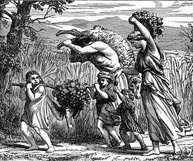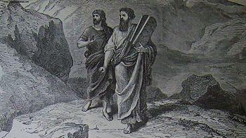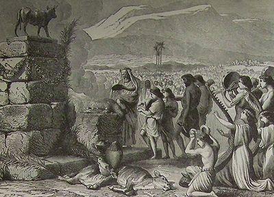 1 Kings 12:25–33 reports a parallel story of golden calves. King Jeroboam of the northern Kingdom of Israel made two calves of gold out of a desire to prevent the kingdom from returning to allegiance to the house of David and the southern Kingdom of Judah.[93] In Exodus 32:4, the people said of the Golden Calf, "This is your god, O Israel, that brought you up out of the land of Egypt." Similarly, in 1 Kings 12:28, Jeroboam told the people of his golden calves, "You have gone up long enough to Jerusalem; behold your gods, O Israel, that brought you up out of the land of Egypt." Jeroboam set up one of the calves in Bethel, and the other in Dan, and the people went to worship before the calf in Dan.[94] Jeroboam made houses of high places, and made priests from people who were not Levites.[95] He ordained a feast like Sukkot on the fifteenth day of the eighth month (a month after the real Sukkot), and he went up to the altar at Bethel to sacrifice to the golden calves that he had made, and he installed his priests there.[96]