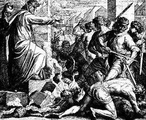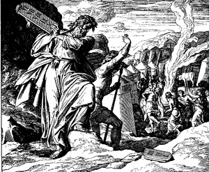 In the continuation of the reading, Moses descended the mountain bearing the two Tablets.[32] Joshua told Moses, "There is a cry of war in the camp," but Moses answered, "It is the sound of song that I hear!"[33] When Moses saw the calf and the dancing, he became enraged and shattered the Tablets at the foot of the mountain.[34] He burned the calf, ground it to powder, strewed it upon the water, and made the Israelites drink it.[35] When Moses asked Aaron how he committed such a great sin, Aaron replied that the people asked him to make a god, so he hurled their gold into the fire, "and out came this calf!"[36] Seeing that Aaron had let the people get out of control, Moses stood in the camp gate and called, "Whoever is for the Lord, come here!"[37] All the Levites rallied to Moses, and at his instruction killed 3,000 people, including brother, neighbor, and kin.[38] Moses went back to God and asked for God either to forgive the Israelites or kill Moses too, but God insisted on punishing only the sinners, which God did by means of a plague.[39] A closed portion (setumah) ends here with the end of chapter 32.[40]