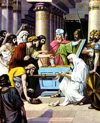 In the continuation of the reading, God directed Moses to make a sacred anointing oil from choice spices — myrrh, cinnamon, cassia — and olive oil.[9] God told Moses to use it to anoint the Tent of Meeting, the furnishings of the Tabernacle, and the priests.[10] God told Moses to warn the Israelites not to copy the sacred anointing oil's recipe for lay purposes, at pain of exile.[11] A closed portion (setumah) ends here.[12]