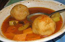 A Syrian soup known as kubbi kishk consists of kubbi "torpedoes" or "footballs" in a yogurt (kishk) and butter broth with stewed cabbage leaves. Another soup, known as kibbeh hamda, consists of a chicken stock with vegetables (usually leeks, celery, turnips and courgettes), lemon juice and garlic, with small kibbeh made with ground rice as dumplings.[14] In the Syrian Jewish diaspora this is popular both at Pesach and as the pre-fast meal on the day before Yom Kippur.[15]