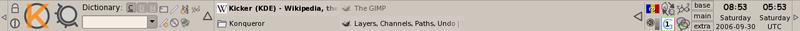 Kicker (also referred to as KDE Panel) is the main panel used in KDE 3 and earlier, and also in the TDE desktop. Together with KDesktop, it forms the graphical shell. It can be customized by the user. By default, it has the K Menu, a Desktop Access button, a Home button, a Konqueror button, a Kontact button, and a Help button. It also has the Desktop Preview & Pager, the Taskbar, the System Tray, and the Clock.