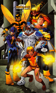 The original Titans East first appeared in the "Titans Tomorrow" storyline in which the Teen Titans meet their villainous older selves in the future.[2] This incarnation of Titans East is a group of former Titans rebelling against the future Titans' rule over the Western United States: