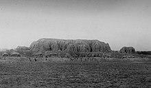 Kafir-kala is an ancient fortress 12 kilometers south of the city center of Samarkand in Uzbekistan, protecting the southern border of the Samarkand oasis.[41] It consists in a central citadel built in mud-bricks and measuring 75 × 75 meters at its base has six towers and is surrounded by a moat, still visible today.[41] Living quarters were located outside the citadel.[41] The citadel was first occupied by the Kidarites in the 4th-5th century, whose coinage and bullae have been found.[42][43]