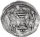 ) in his coinage minted at Balkh in Bactria, circa 340-345.[22] The tamgha replaced the nandipada symbol which had been in use since Vasudeva I,[22] suggesting that the Kidarites had now taken control, first under their ruler Kirada.[23] Then ram horns were added to the effigy of Varahran on his coinage for a brief period under the Kidarite ruler Peroz, and raised ribbons were added around the crown ball under the Kidarite ruler Kidara.[24][25][22][23] In effect, Varahran has been described as a "puppet" of the Kidarites.[26] By 365, the Kidarite ruler Kidara I was placing his name on the coinage of the region, and assumed the title of Kushanshah.[23] In Gandhara too, the Kidarites minted silver coins in the name of Varahran, until Kidara also introduced his own name there.[23]