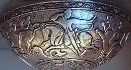 The numismatic evidence as well as the so-called "Hephthalite bowl" from Gandhara, now in the British Museum, suggests a period of peaceful coexistence between the Kidarites and the Alchons, as it features two Kidarite noble hunters wearing their characteristic crowns, together with two Alchon hunters and one of the Alchons inside a medallion.[72] At one point, the Kidarites withdrew from Gandhara, and the Alchons took over their mints from the time of Khingila.[72] By 520, Gandhara was definitely under Hephthalite (Alchon Huns) control, according to Chinese pilgrims.[18]