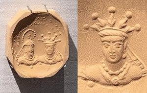 The Kidarites appear to have been synonymous with the Karmir Xyon ("Red Xionites" or, more controversially, "Red Huns"),[14][15] – a major subdivision of the Chionites (Xionites), alongside the Spet Xyon ("White Xionites"). In a recently discovered seal with the image of a ruler similar to those of the Kidarite coins, the ruler named himself in Bactrian "King of the Huns and Great Kushan Shah" (uonano shao o(a)zarko (k)oshanoshao). The discovery was reportedly made in Swat.[16][17]