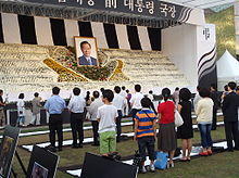 Kim died on 18 August 2009 at 13:43 KST, at Severance Hospital of Yonsei University in Seoul.[36] He was first admitted to hospital suffering from pneumonia on 13 July. The cause of death was cardiac arrest caused by multiple organ dysfunction syndrome.[7] An interfaith state funeral was held for him on 23 August 2009 in front of the National Assembly Building, with a procession leading to the Seoul National Cemetery where he was interred according to Catholic traditions. He is the second person in South Korean history to be given a state funeral after Park Chung-hee.[37] North Korea sent a delegation to his funeral.[38]