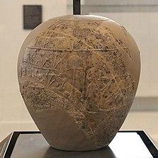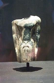The only pictorial evidence of his existence is the so-called Scorpion Macehead, which was found in the Main deposit by archeologists James E. Quibell and Frederick W. Green in a temple at Nekhen (Hierakonpolis) during the dig season of 1897–1898.[8] It is currently on display at the Ashmolean Museum, Oxford. The stratigraphy of this macehead was lost due to the methods of its excavators, but its style seems to date it to the very end of the Predynastic Period.[9]
