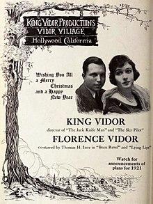 In 1915 newlyweds Vidor and actress Florence Arto Vidor, with business partner Sedgwick, immigrated to California in search of employment in the emerging Hollywood movie industry, arriving on the West Coast virtually penniless.[27]