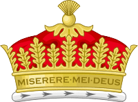 The English and Scottish kings of arms are the only officers of arms to have a distinctive crown of office, used for ceremonial purposes such as at coronations (as opposed to peers, who instead wear a coronet). At the coronation of Queen Elizabeth II, the kings of arms used a crown trimmed with sixteen acanthus leaves alternating in height, and inscribed with the words Miserere mei Deus secundum magnam misericordiam tuam (Have mercy upon me, O God, according to Thy great mercy; Psalm 51). When this crown is shown in pictorial representations, nine leaves and the first three words are shown. Recently, a new crown has been made for the Lord Lyon, modelled on the Scottish Royal crown among the Honours of Scotland. This crown has removable arches (like one of the late Queen Mother's crowns) which will be removed at coronations to avoid any hint of lèse majesté.