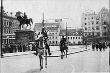 In November 1918 the National Council of the State of Slovenes, Croats and Serbs appointed 28 members to start negotiation with the representatives of the government of the Kingdom of Serbia and Montenegro on creation of a new Yugoslav state, the delegation negotiated directly with regent Alexander Karađorđević.[13] The negotiations would end, with the delegation of the National Council of the State of Slovenes, Croats and Serbs led by Ante Pavelić reading the address in front of regent Alexander, who represented his father, King Peter I of Serbia, by which acceptance the Kingdom of Serbs, Croats and Slovenes was established.[14]