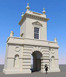 Several designs exist for this building which was sited at the far extremity of the Kings Weston estate to the west and acted as both an eye-catcher from the house and a belvedere to view ships arriving in the Avon and Severn Estuary. Although a design exists attributed to Colen Campbell it is undoubtedly Vanbrugh's final design that was constructed some time in about 1724.[22] The building took the form of an archway over which was a small room, sometimes referred to as the "Breakfasting room".