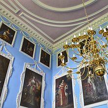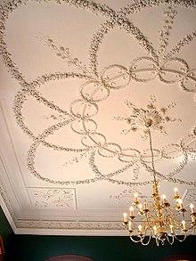 Visitors to the house as it stood after the completion of Vanbrugh's design would have first encountered a huge entrance saloon, two stories high.[22] Beyond this was a stair hall of three storeys in height, with arched openings to the entrance saloon at first-floor height, so that the upper part of the entrance saloon could be seen from within it.[22] These arches were filled in as part of Mylne's remodelling, which though it increased the comfort and charm, reduced the spatial drama.[22] The additional wall space in the entrance saloon was designed to display Southwell's recently inherited collection of ancestral portraits, and Thomas Stocking was employed to execute a scheme of plaster framing for these to Mylne's design.[23] A black and white chequered marble floor and a chimneypiece by John Devall were also added to the entrance saloon at this time.[23]