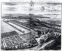 The park surrounding the house was extensive.[2] An avenue extended to the southwest, and there were formal parterres to the southeast.[2] The Kip illustration also shows a banqueting house, which survived as a ruin until 1966, when it was destroyed by vandals.[12] An architectural drawing dated 1707 describes it as being 'after the Modell of the Duke of Ormonds at Richmond', and it consisted of two floors, the lower one a workspace and the upper serving as the dining area.[12] Because the building was on a steep slope. both floors were accessible from ground level, and the south facade consisted of a single storey.[12] This south facade was constructed of red rubbing bricks laid in Flemish bond with exceptionally fine jointing, consisting of a little less than 1/16 inch of slaked lime putty.[12]
